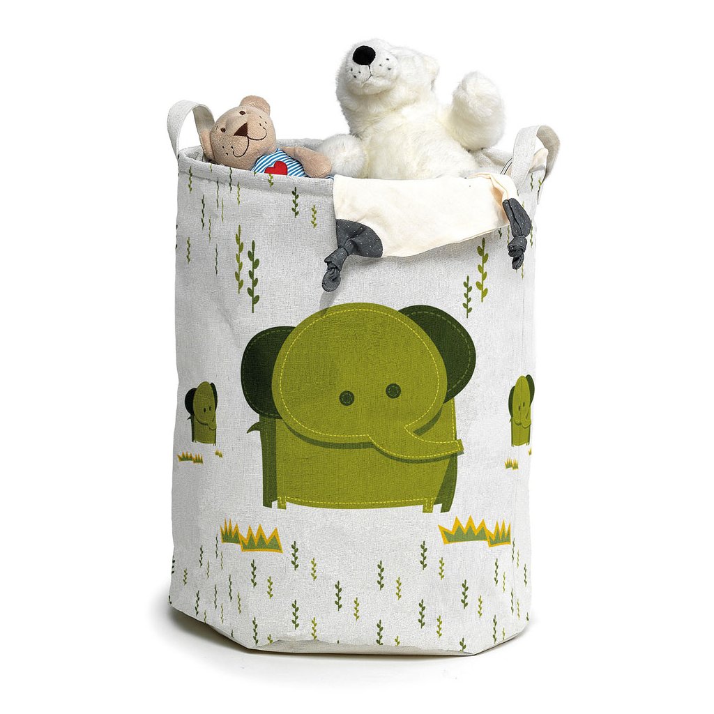 Textilný oválny košík na hračky svetlosivej farby so zeleným obrázkom slona. Rozmery ø 35 x 45 cm.