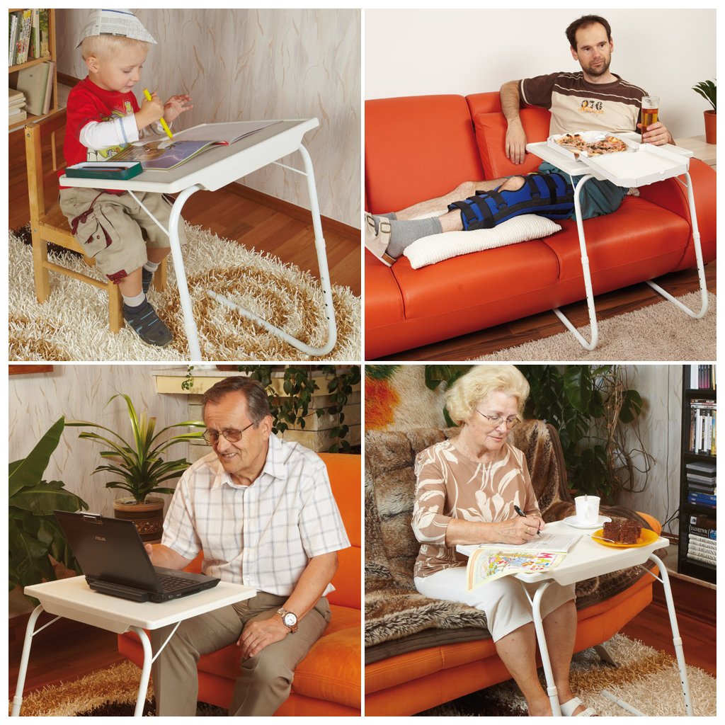 Univerzálny stolík je ľahko prenosný. Zloženie i skladovanie stolíka je jednoduché, u stolíku oceníte priestornú a umývateľnú vrchnú dosku. Stolík je ľahký, povrch konštrukcie je hladký, preto nepoškodzuje podlahy ..