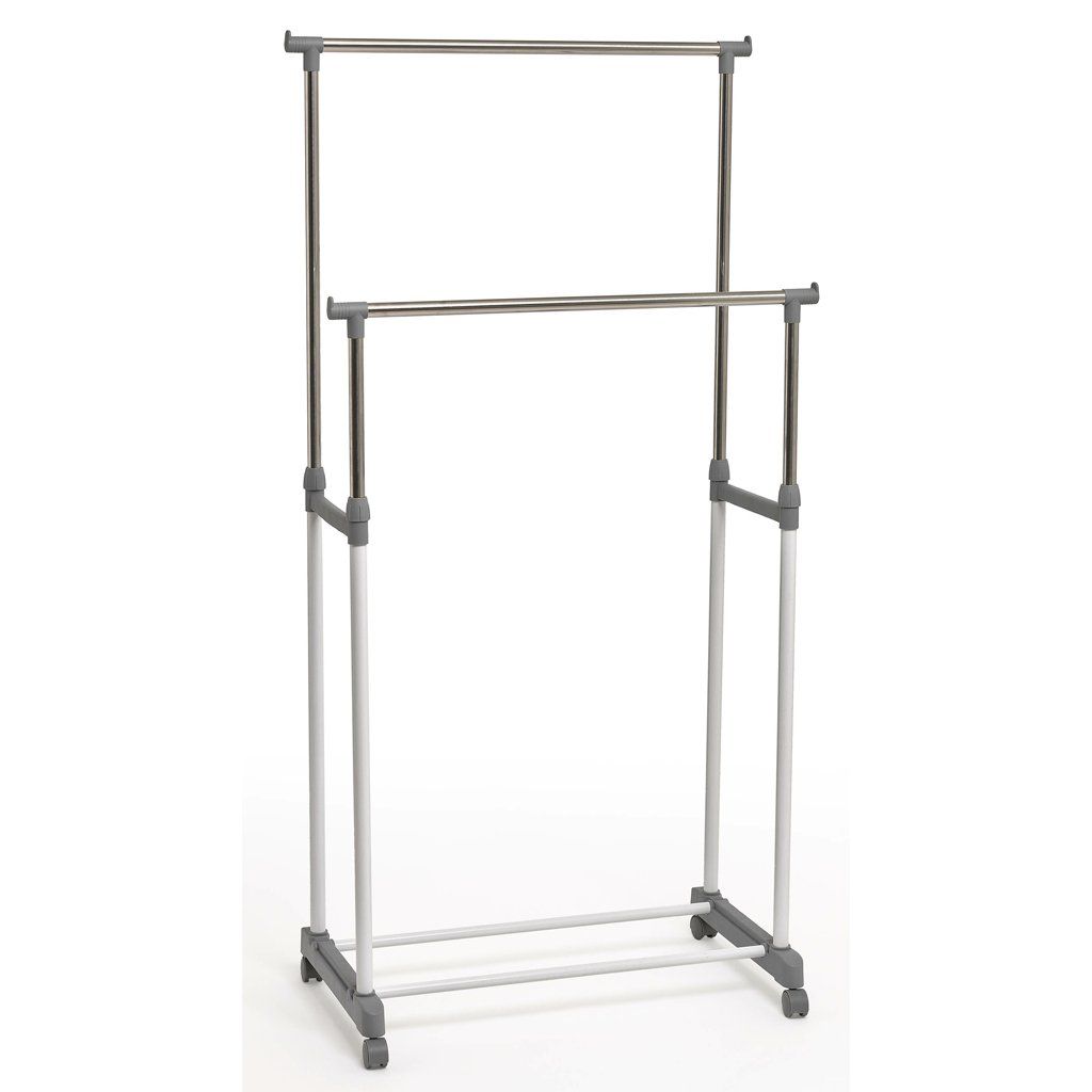 Mobilný nastaviteľný vešiak na oblečenie, dvojitý, rozkladací. Farba biela a sivá. Šírka 160 cm, výška 150 a 95 cm.