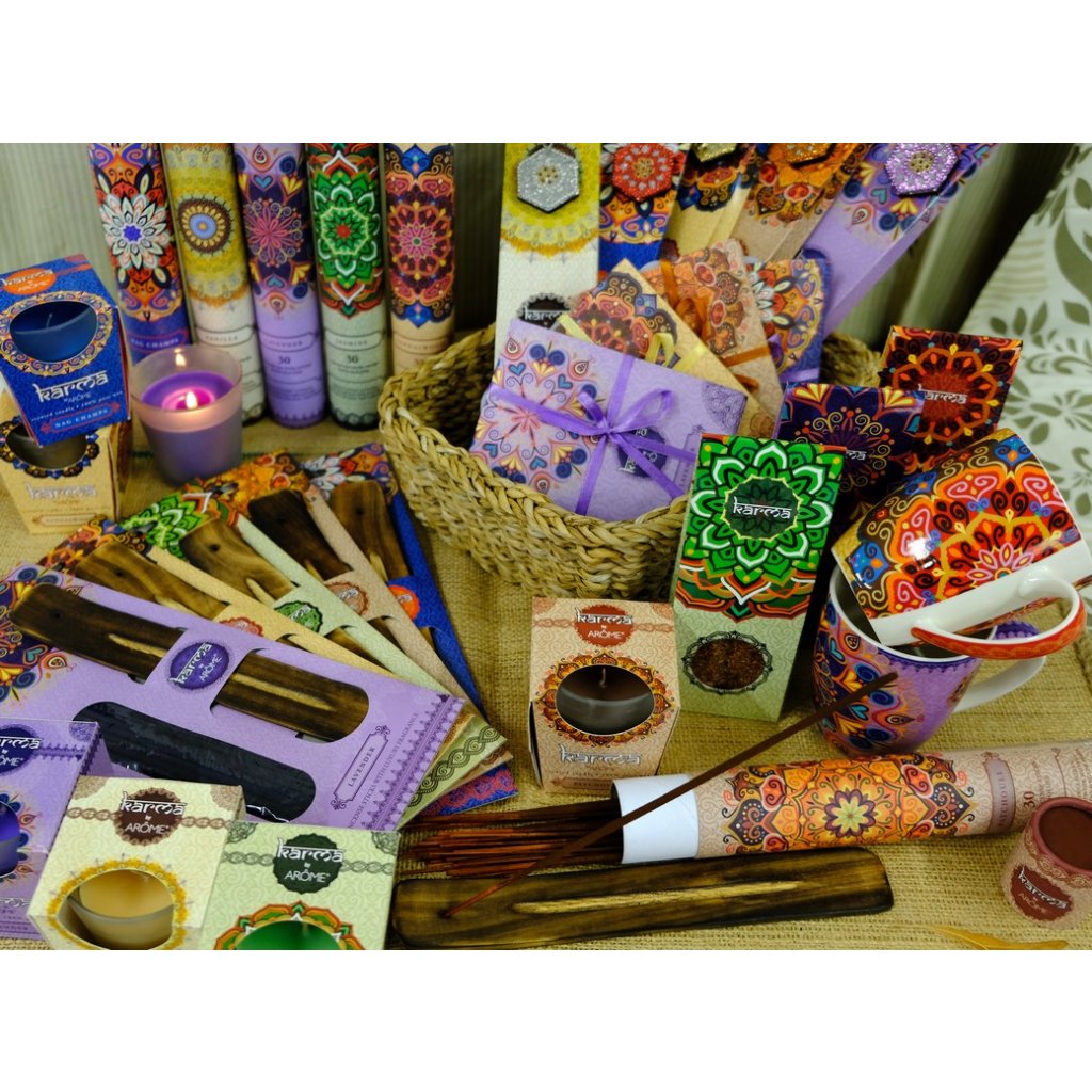 20 ks vonných tyčiniek so stojanom na tyčinku, ktorý slúži zároveň i ako lapač popola. Vône Nag champa prevoňajú najmä veľké priestory príjemnou koreňovou vôňou a navodia posvätnú atmosféru. Kolekcia Karma - Mandala je plná vôní, nakombinujte sviečku, vonné tyčinky a napríklad hrnček a vznikne vám krásny darčekový set.